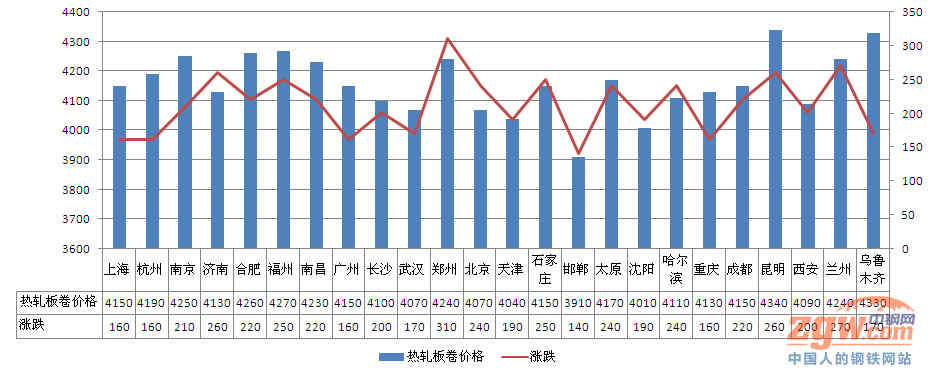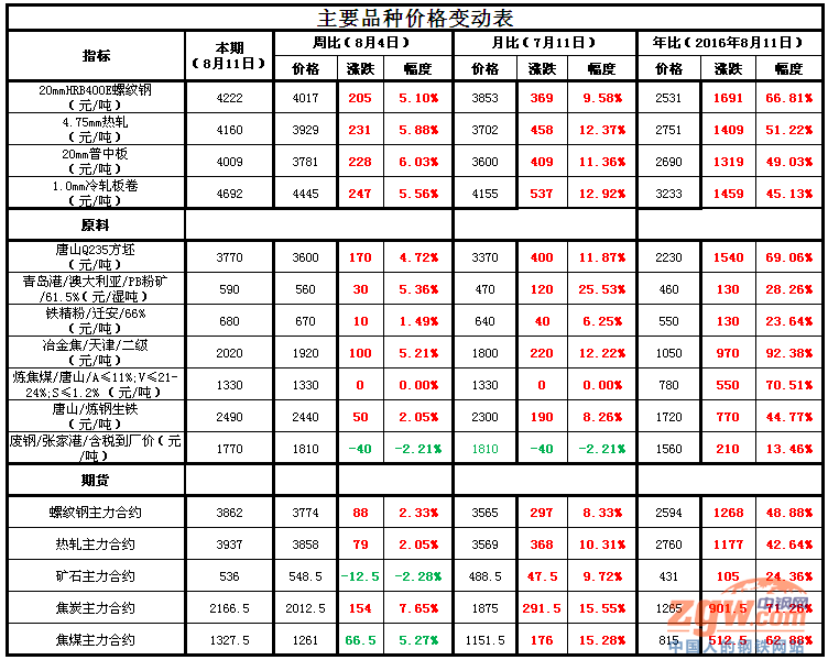据中钢网监测数据显示,11日全国24个主要市场螺纹钢 20mm HRB400E平均价格4222元/吨,周环比上涨5.10%,同比上涨66.81%;全国24个主要市场4.75mm 热轧板卷平均价格4160元/吨, 周环比上涨5.88%,同比上涨51.22%;全国23个主要市场14-20mm 普中板平均价格4009元/吨, 周环比上涨6.03%,同比上涨49.03%;全国23个主要市场1.0mm 冷轧板卷平均价格4692元/吨, 周环比上涨5.56%,同比上涨45.13%。