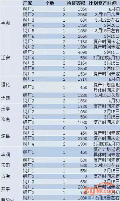 目前采暖季限产近尾声,我网通过与唐山钢厂的实时沟通了解到,部分钢企表示由于环保方面烧结限产影响了高炉的复产,预计3月底或者4月初恢复一定的生产能力,但大部分钢企后期将按照文件在非取暖季期间执行10-15%的限产比例继续执行限产。 唐山98家钢企高炉复产计划,66%在检修、17%计划3月15日,6%计划4月初、10%未定、1%延迟。